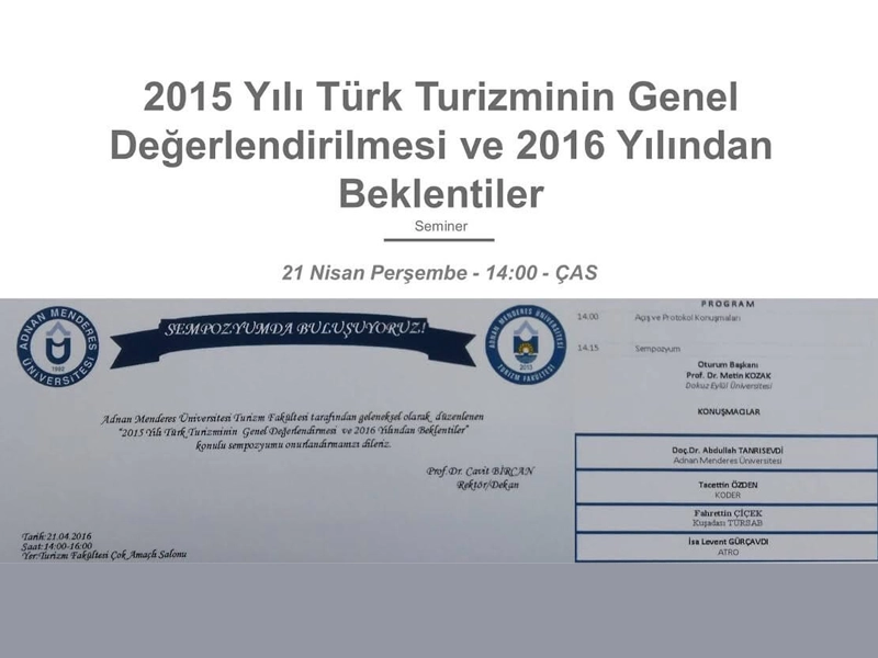 21 Nisan 2016 Perşembe Günü 12.00-13.00 saatleri arasında Turizm Fakültesi Çok Amaçlı Salonu (ÇAS)nda Prof. Dr. Kurtuluş OLGUNun katılımıyla Türkiye Faunası konusunda bir söyleşi ve aynı gün aynı salonda Saat: 14.00-16.00 arası Adnan Menderes Üniversitesi Turizm Fakültesi tarafından geleneksel olarak düzenlenen, ATRO Yönetim Kurulu Başkanımız İsa Levent GÜRÇAVDInın konuşmacı olarak katılacağı 2015 Yılı Türk Turizminin Genel Değerlendirmesi ve 2016 Yılından Beklentiler konulu sempozyum gerçekleştirilecektir.