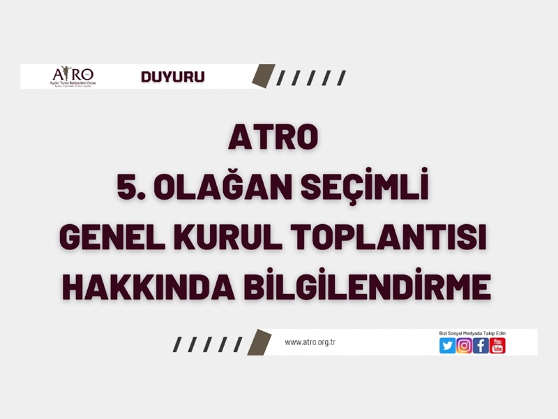 Odamızın 5. Olağan Seçimli Genel Kurulu 21 KASIM 2024 Perşembe günü 10.00’da Ata Mahallesi Denizli Bulvarı No:18 Efeler/AYDIN adresinde yer alan Aydın Ticaret Borsası Konferans Salonunda çoğunluk aranmaksızın yapılacaktır.