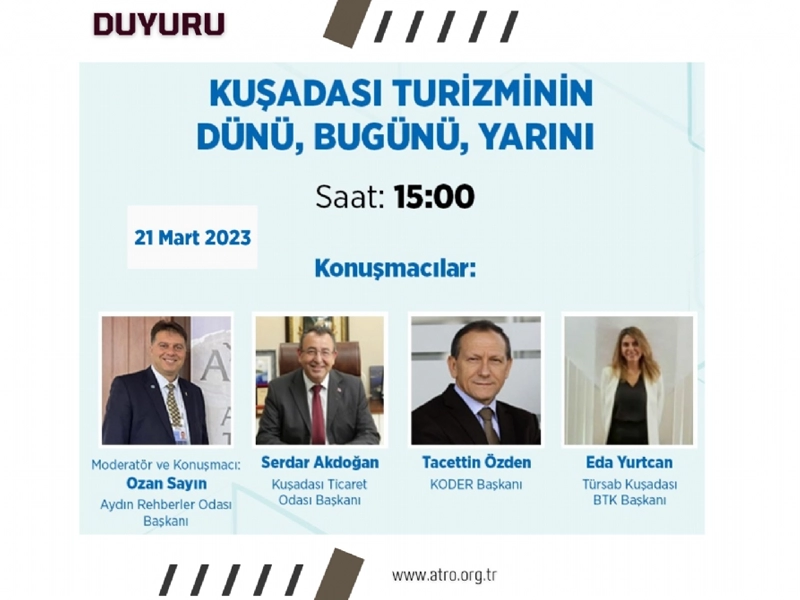 Değerli üyelerimiz, Kuşadası Hotel Restaurant Ekipmanları Ev Dışı Tüketim Fuarı 21 Mart 2023 tarihinde saat : 14.00`de açılışı yapılacaktır. Fuar kapsamında aynı gün saat : 15.00`de Yönetim Kurulu Başkanımızın Ozan SAYIN`ın Moderatör ve Konuşmacı olduğu Kuşadası Turizminin Dünü, Bugünü, Yarını konulu panel düzenlenecektir.