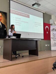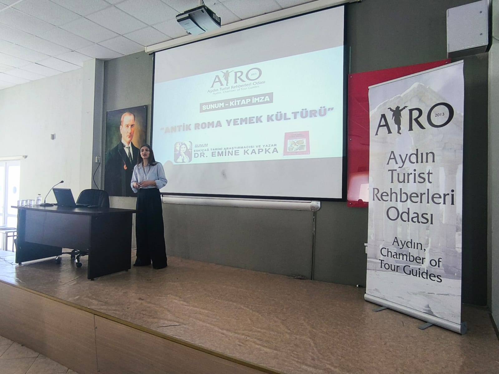 Odamızın eğitim faaliyetleri kapsamında, 12 Mart 2026 tarihinde, Eskiçağ Tarihi Araştırmacısı ve Yazar Dr. Emine Kapka’nın anlatımıyla “Antik Roma Yemek Kültürü” konulu sunum; üyelerimizin ve ADÜ Turist Rehberliği Bölümü öğrencilerinin katılımıyla gerçekleştirilmiştir.