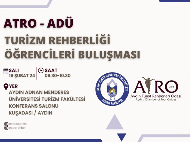 19 Şubat 2024 Pazartesi günü (Yarın) 09.30-10.30 saatleri arasında Aydın Adnan Menderes Üniversitesi Kuşadası Turizm Fakültesi Konferans Salonunda ATRO Yönetim Kurulu Üyeleri ve ADÜ Turizm Rehberliği öğrencileri ile söyleşi düzenlenecektir.