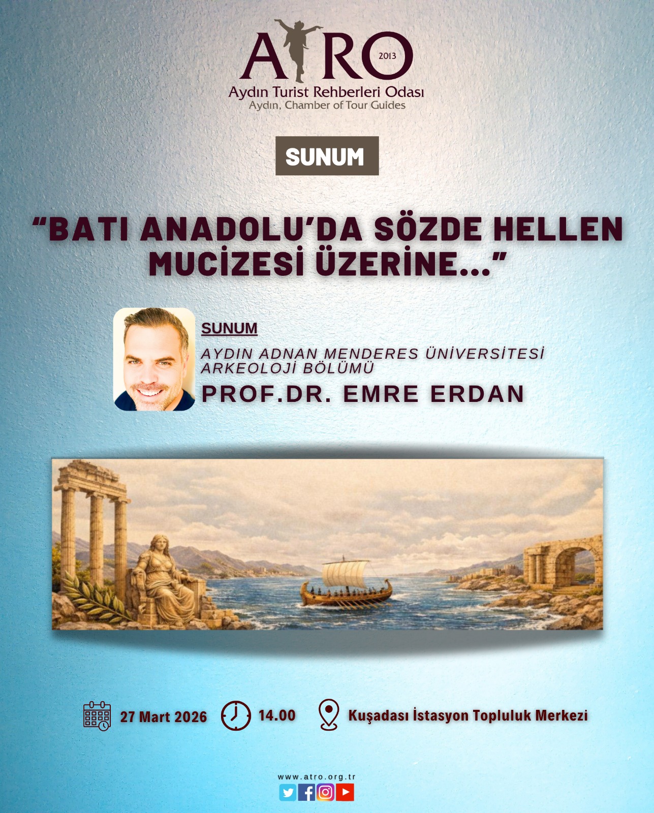 Odamızın eğitim faaliyetleri kapsamında, 27 Mart 2026 tarihinde Prof.Dr. Emre Erdan’ın anlatımıyla “Batı Anadolu’da Sözde Hellen Mucizesi Üzerine…” konulu bir sunum gerçekleştirilecektir.