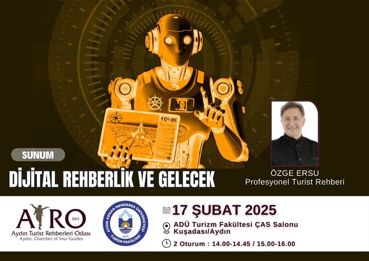 Odamızın eğitim faaliyetleri kapsamında 17.02.2025 tarihinde ADÜ Turizm Fakültesi ÇAS Toplantı Salonunda 2 Oturum olarak, Profesyonel Turist Rehberi Özge ERSU anlatımıyla “ DİJİTAL REHBERLİK VE GELECEK ” konulu sunum düzenlenecektir.