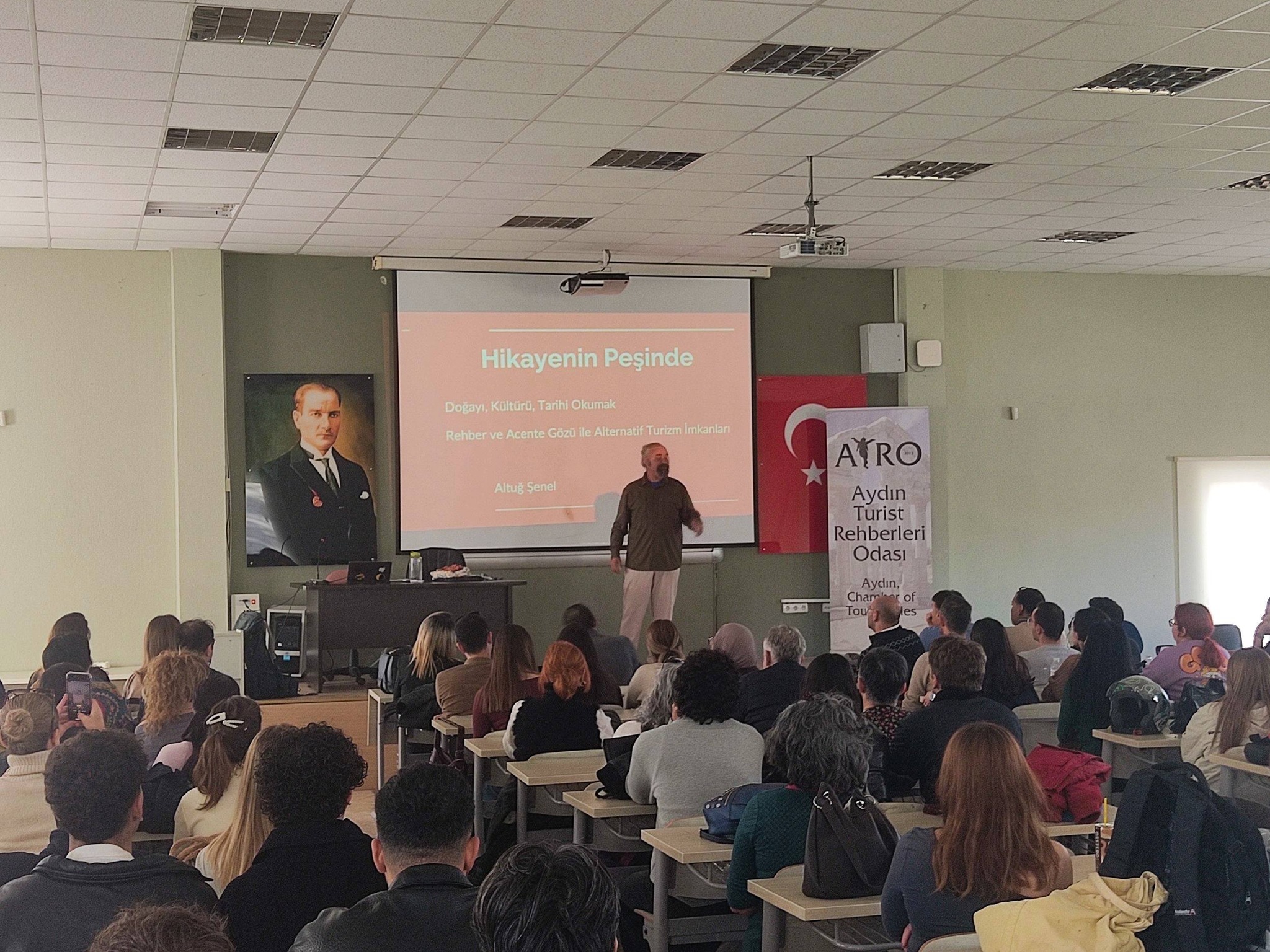 Odamızın eğitim faaliyetleri kapsamında Profesyonel Turist Rehberi Altuğ Şenel’in anlatımıyla “Hikayenin peşinde Doğayı, kültürü, tarihi okumak… – Rehber ve Acente gözü ile alternatif turizm fırsatları ve imkanları” konulu sunum/söyleşi üyelerimiz ve ADÜ Turist Rehberliği bölümü öğrencilerinin katılımlarıyla 24.12.2025 tarihinde gerçekleştirilmiştir.