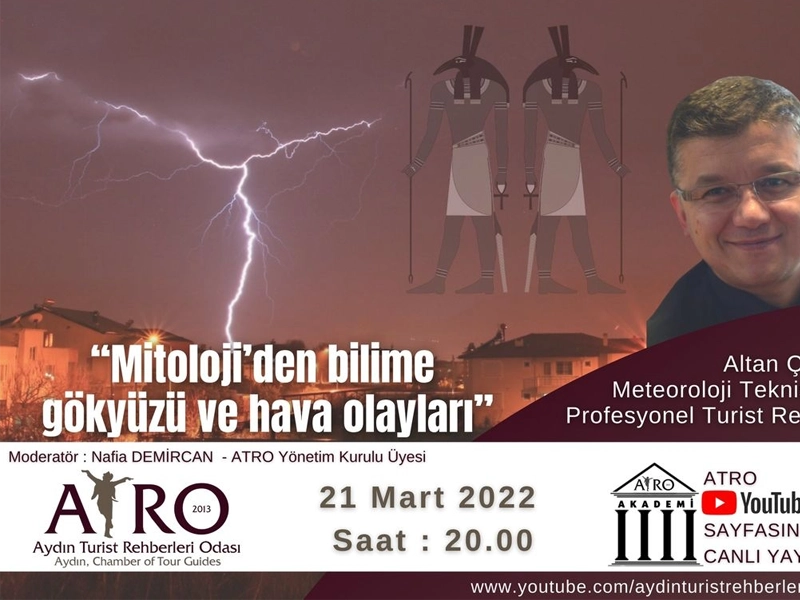 Değerli üyelerimiz; Odamızın Mart ayı etkinlikleri kapsamında 21.03.2022 tarihinde Yönetim Kurulu Üyemiz Nafia DEMİRCAN moderatörlüğünde, Meteoroloji Teknisyeni ve Profesyonel Turist Rehberi Altan ÇELİK`in anlatımıyla Mitoloji’den bilime gökyüzü ve hava olayları” konulu canlı yayın düzenlenecektir.