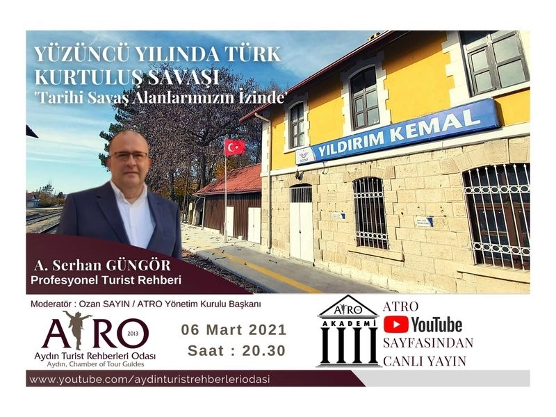 Odamız tarafından 06.03.2021 (Cumartesi) tarihinde saat: 20.30`da ATRO Youtube Sayfası üzerinden canlı olarak, Yönetim Kurulu Başkanımız Ozan SAYIN moderatörlüğünde, Profesyonel Turist Rehberi A. Serhan GÜNGÖR`ün anlatımıyla; “YÜZÜNCÜ YILINDA TÜRK KURTULUŞ SAVAŞI `Tarihi Savaş Alanlarımızın İzinde` başlıklı sunum düzenlenecektir.