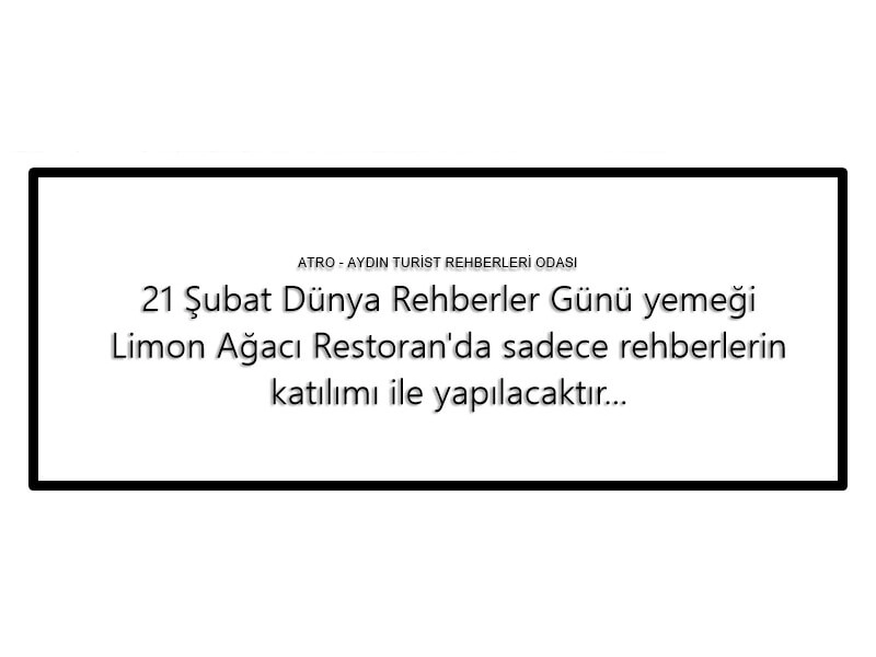 21 Şubat Dünya Rehberler Günü yemeği Limon Ağacı Restoran da sadece rehberlerin katılımı ile yapılacaktır, yemek ücreti 40 TL.dir. Rehberler eşleri veya (Kız-Erkek) arkadaşları ile katılabilir.